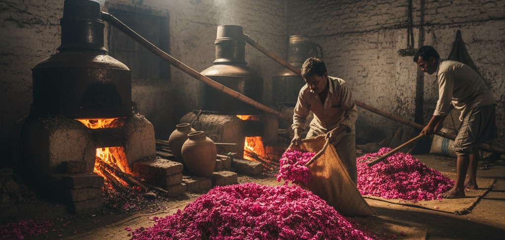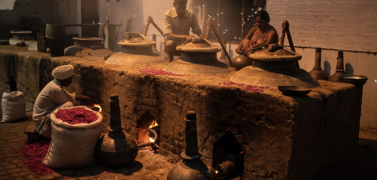 Within our ateliers—where French science meets Indian artistry—the true alchemy begins. Surrounded by the wisdom of ages and the eagerness of innovators, creators measure, blend, and refine each essence. It is a meeting of worlds: Kannauj’s soulful distillation dances with French precision, forging scents that are both intimate and eternal.Â